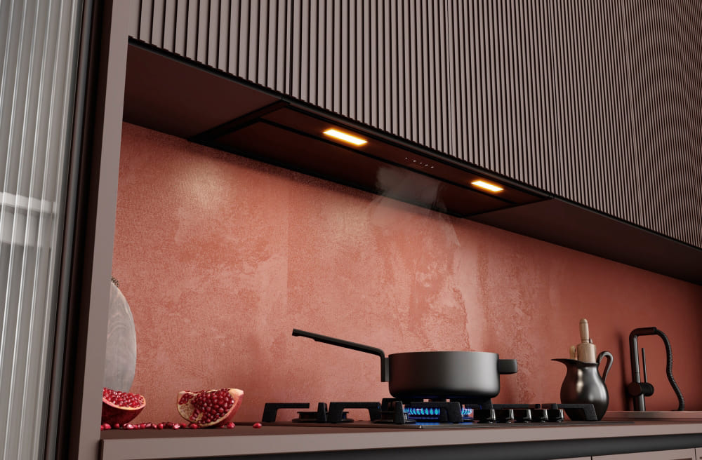 Вытяжка устанавливается в шкаф или в потолочную нишу — таким образом все соединительные элементы и корпус оказываются скрыты. Это подходящий вариант для небольшого помещения, если нужно максимально освободить пространство, а также необходимость, если вы продумываете кухонный дизайн до мелочей.