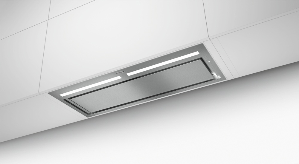 Вытяжка, встраиваемая в потолок, часто устанавливается над кухонным островом в просторной кухне и отличается достаточно высокой мощностью: она может работать как в режиме рециркуляции, так и в режиме отвода, так как воздуховод также скрыт в потолке. Вытяжки могут монтироваться в подвесной потолок либо устанавливаться в специальные многоярусные конструкции из гипсокартона непосредственно во время ремонта кухни. Для управления ими используется пульт ДУ.