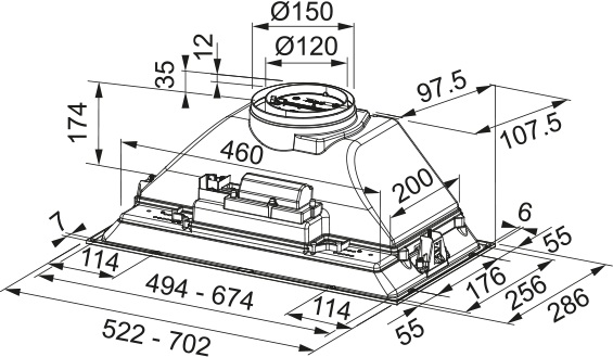 Встраиваемая вытяжка Franke FBI 525 BK — компактное и функциональное решение для современной кухни, разработанное с акцентом на эффективность, эстетику и удобство монтажа. Модель предназначена для встраивания в навесной шкаф, что позволяет сохранить гармонию интерьера и избежать визуального перегруза. Её габариты — всего 17,4 см в высоту, 52,2 см в ширину и 28,6 см в глубину — делают устройство одним из самых низкопрофильных в своём классе, идеально подходящим для кухонь с ограниченным пространством над варочной поверхностью.