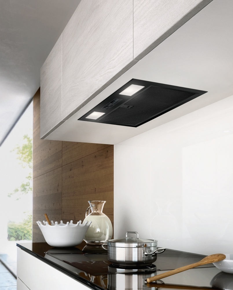 Вытяжка, встраиваемая в потолок, часто устанавливается над кухонным островом в просторной кухне и отличается достаточно высокой мощностью: она может работать как в режиме рециркуляции, так и в режиме отвода, так как воздуховод также скрыт в потолке. Вытяжки могут монтироваться в подвесной потолок либо устанавливаться в специальные многоярусные конструкции из гипсокартона непосредственно во время ремонта кухни. Для управления ими используется пульт ДУ.