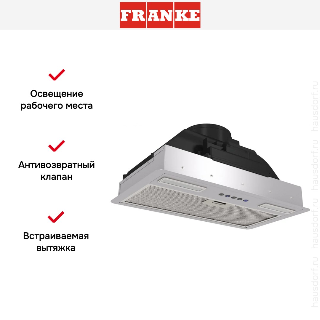 Встраиваемая вытяжка — выбор тех, кто хочет максимально задекорировать технику, или владельцев маленькой кухни. Тип встраивания: в шкаф. Обратите внимание на цветовые сочетания модели Franke FLICK 60 SS, чтобы органично вписать ее в свою квартиру. Оттенок корпуса: серый. Благодаря лампочкам, которые расположены на нем, можно освещать плиту и столешницу рядом, чтобы готовить было еще проще и приятнее.