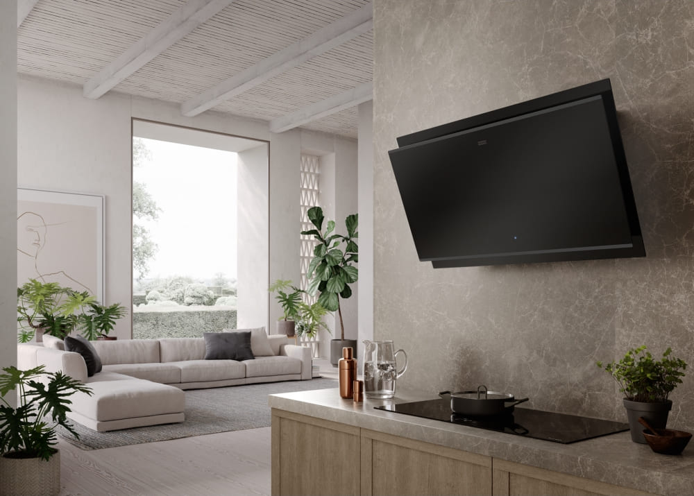 Воздух всасывается по периметру вытяжки через узкие щели. Он собирается в потоки, которые направляются прямо к фильтрам внутри, не рассеивается на кухне. Благодаря этой технологией вытяжку можно сделать компактнее и энергоэффективнее.