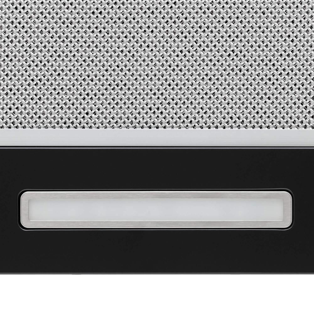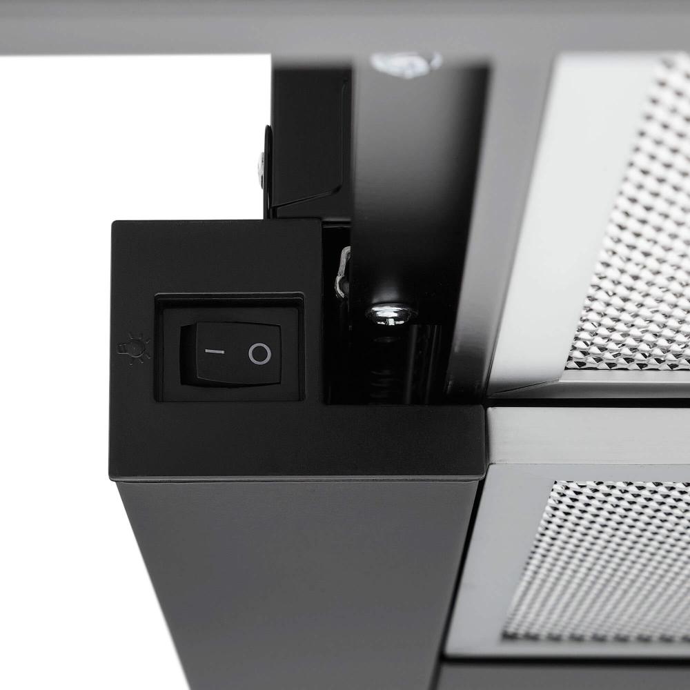 Можно выделить два основных вида вытяжек с выдвижной панелью. В вытяжках, встраиваемых в подвесной шкаф, выдвижная панель необходима, так как размеры таких устройств определяются размерами самого шкафа. В закрытом состоянии глубина вытяжки может быть меньше глубины варочной поверхности. Телескопическая выдвижная панель, которая устанавливается преимущественно в устройствах, работающих в режиме отвода, гарантирует полный захват воздуха, загрязненного каплями жира, частицами сажи, испарениями. Панель можно выдвинуть как нажатием на кнопку, так и потянув за ее переднюю часть. В некоторых моделях при подобном выдвижении одновременно включается подсветка. Когда же панель убрана, вытяжка становится практически незаметной — такой вариант лучше всего подходит для небольшой кухни.