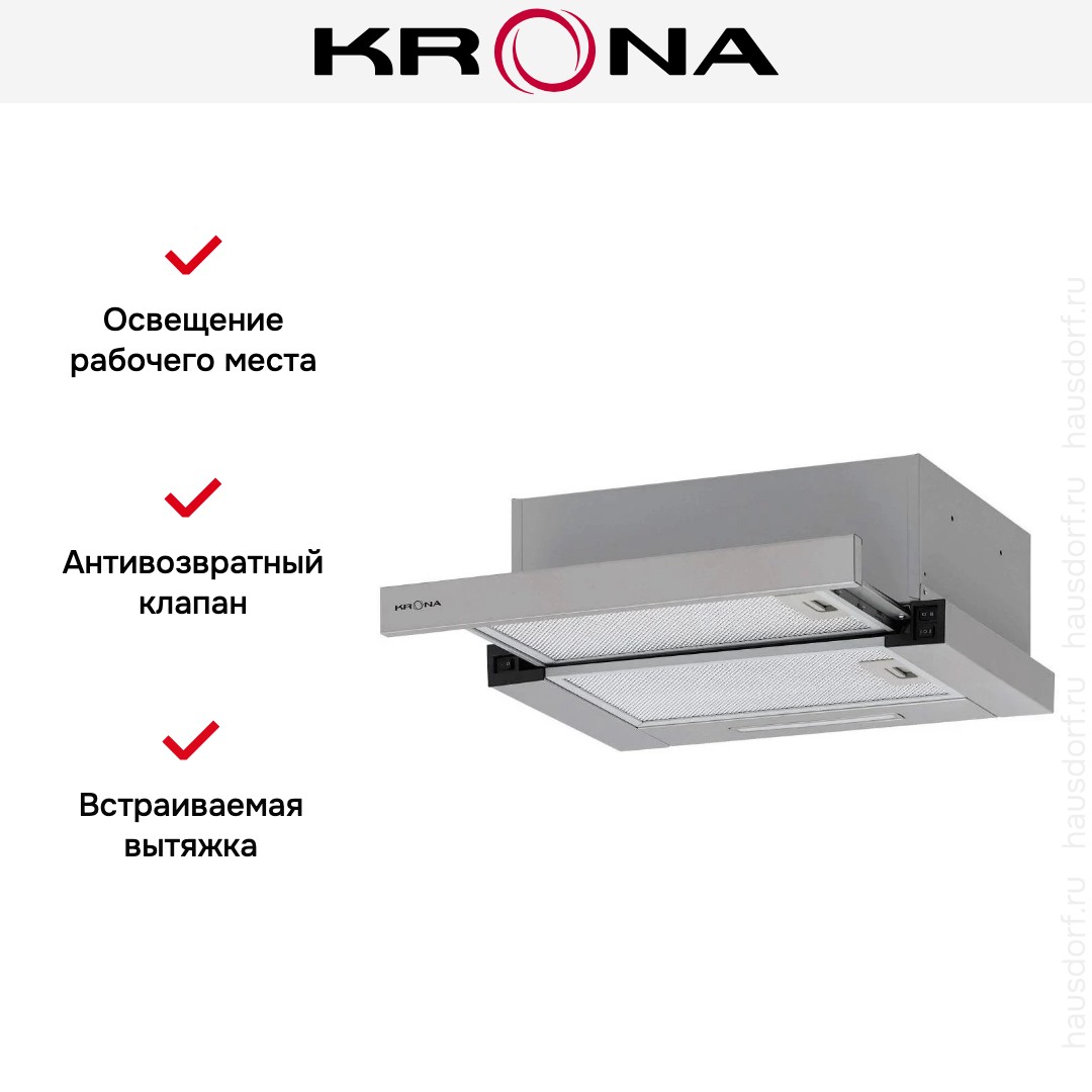 Встраиваемая вытяжка — выбор тех, кто хочет максимально задекорировать технику, или владельцев маленькой кухни. Тип встраивания: в шкаф. Обратите внимание на цветовые сочетания модели KRONA KAMILLA F 450 inox, чтобы органично вписать ее в свою квартиру. Оттенок корпуса: нержавеющая сталь. Благодаря лампочкам, которые расположены на нем, можно освещать плиту и столешницу рядом, чтобы готовить было еще проще и приятнее. Фишка этой техники — выдвижная панель.