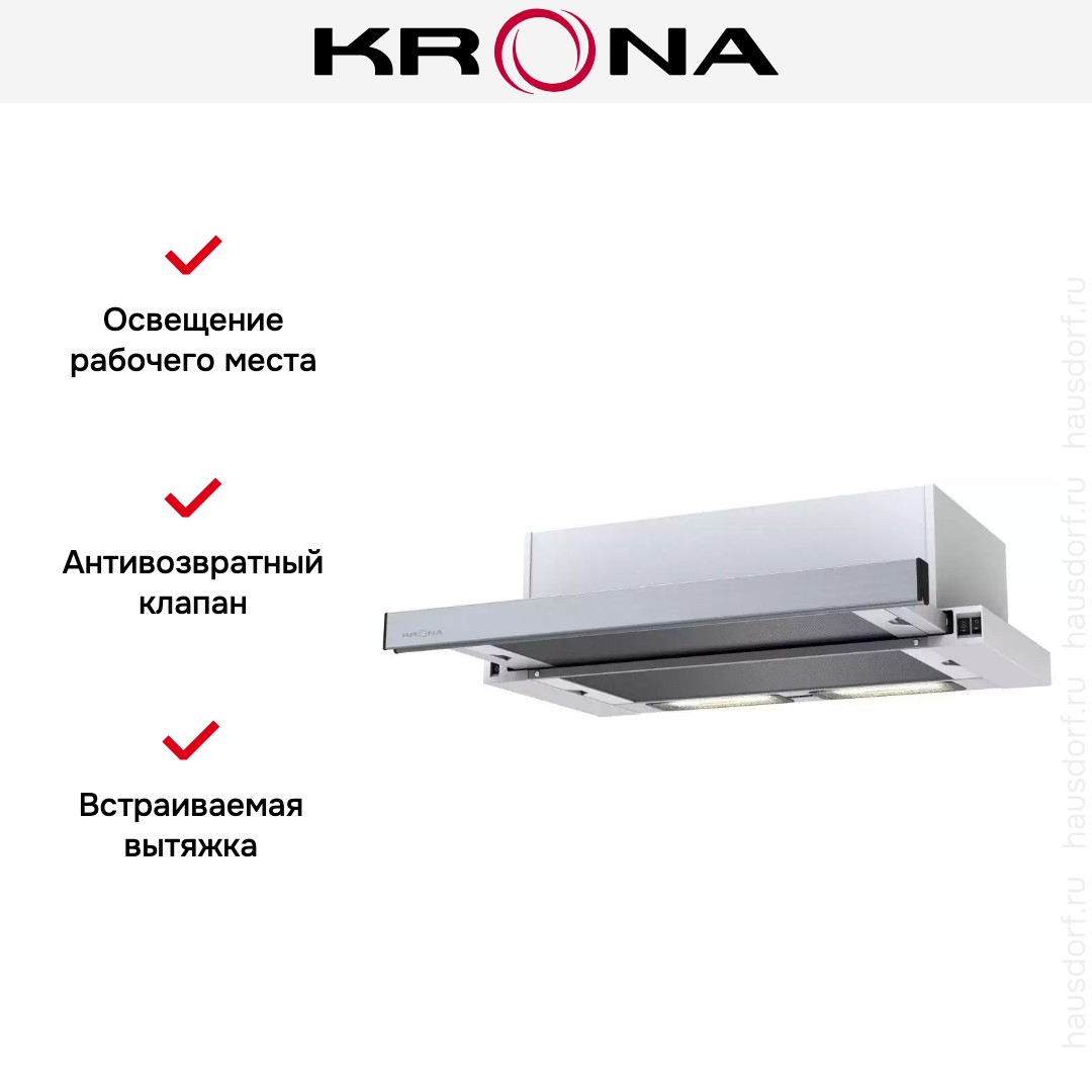 Встраиваемая вытяжка — выбор тех, кто хочет максимально задекорировать технику, или владельцев маленькой кухни. Тип встраивания: в шкаф. Обратите внимание на цветовые сочетания модели KRONA VENDY 600 INOX (1 мотор), чтобы органично вписать ее в свою квартиру. Оттенок корпуса: нержавеющая сталь. Благодаря лампочкам, которые расположены на нем, можно освещать плиту и столешницу рядом, чтобы готовить было еще проще и приятнее. Фишка этой техники — выдвижная панель.