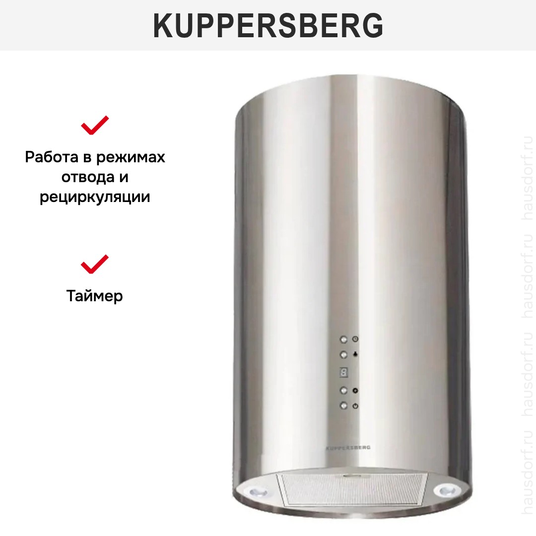 Данная вытяжка крепится к потолку — обычно над кухонным островом, где расположена рабочая зона. Обратите внимание на цветовые сочетания модели Kuppersberg TUBA 35 X, чтобы органично вписать ее в свою квартиру. Оттенок корпуса: нержавеющая сталь. Благодаря лампочкам, которые расположены на нем, можно освещать плиту и столешницу рядом, чтобы готовить было еще проще и приятнее.
