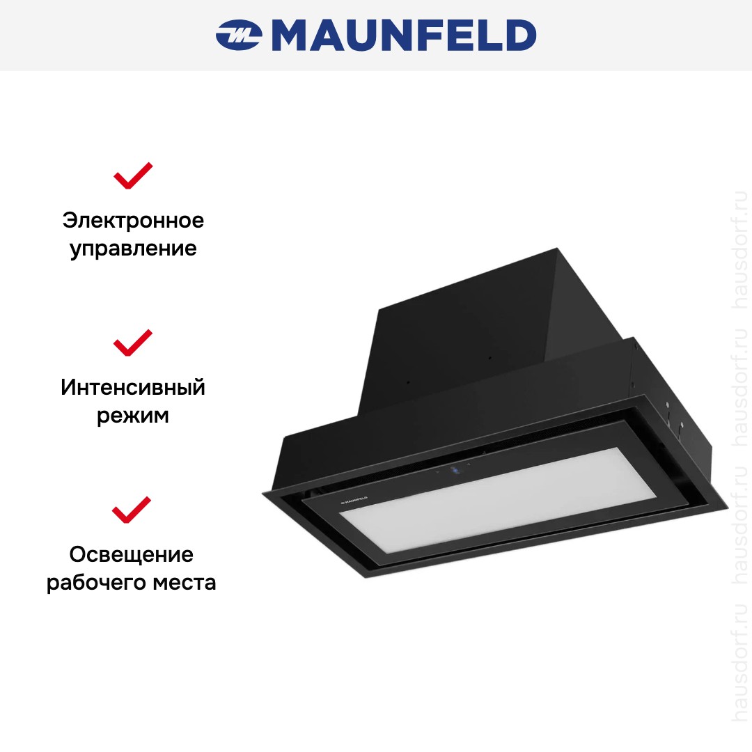 Встраиваемая вытяжка — выбор тех, кто хочет максимально задекорировать технику, или владельцев маленькой кухни. Тип встраивания: в шкаф. Обратите внимание на цветовые сочетания модели Maunfeld MZR 74 Lux Вlack, чтобы органично вписать ее в свою квартиру. Оттенок корпуса: черный. Благодаря лампочкам, которые расположены на нем, можно освещать плиту и столешницу рядом, чтобы готовить было еще проще и приятнее.
