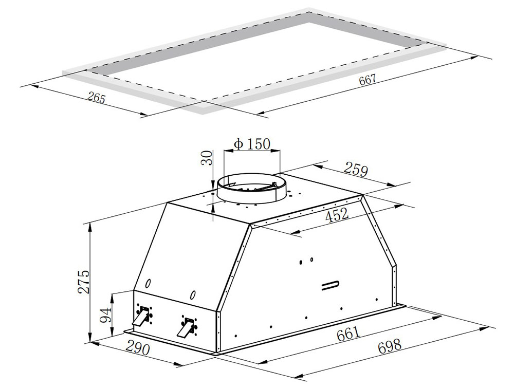 У многих встраиваемых моделей глубина может регулироваться, а рабочая всасывающая поверхность — увеличиваться благодаря выдвижному козырьку, но габариты корпуса такой вытяжки должны соответствовать размерам подвесного шкафа. Выбирать основные размеры вытяжки с соблюдением всех требований эффективности и безопасности работы следует также не в ущерб общему дизайну помещения.