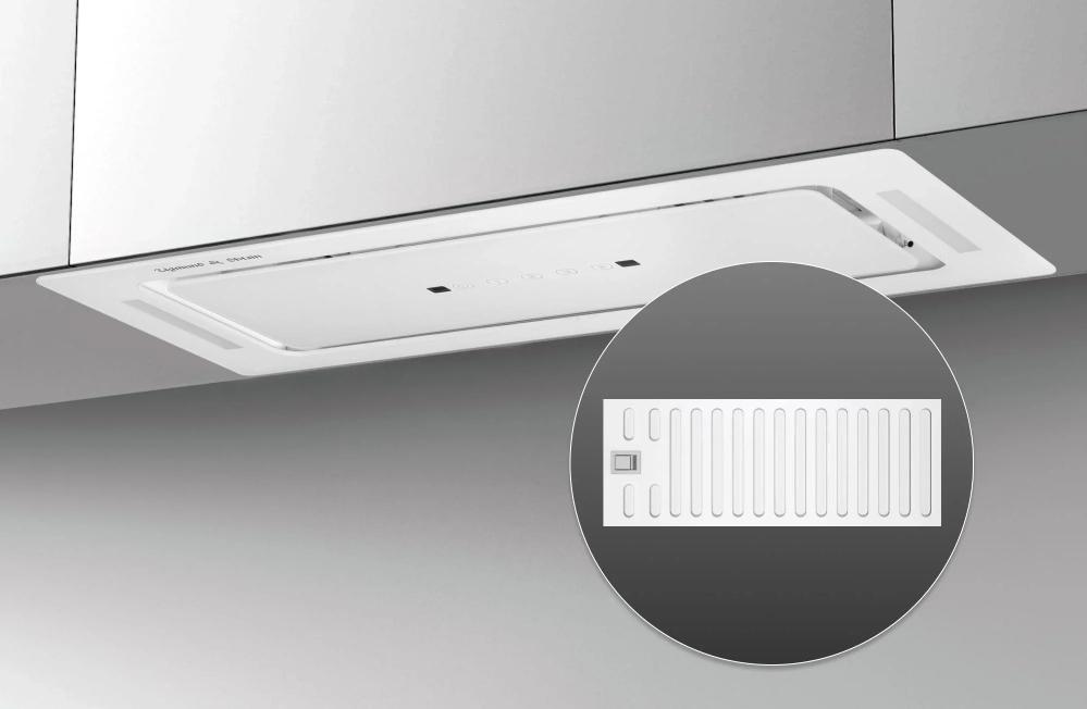 Вытяжки, встраиваемые в столешницу — эффективная инновация, которая подойдет для установки в кухне любой площади. Такие вытяжки размещаются за варочной поверхностью или рядом с ней. В отключенном состоянии всасывающая панель находится под столешницей, но после включения одной или нескольких конфорок она автоматически выдвигается при помощи специального лифтового механизма. Загрязненный воздух улавливается, не успевая распространиться по помещению. Когда вытяжка убрана, на виду остается только сенсорная панель управления. Недостатком подобных моделей является только сравнительно высокая цена.