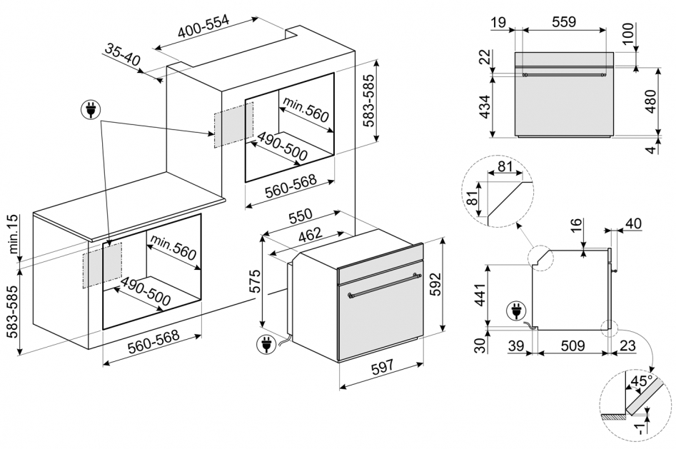 Smeg SFP68C1TPO - схема с размерами к духовому шкафу на разных языках на Hausdorf