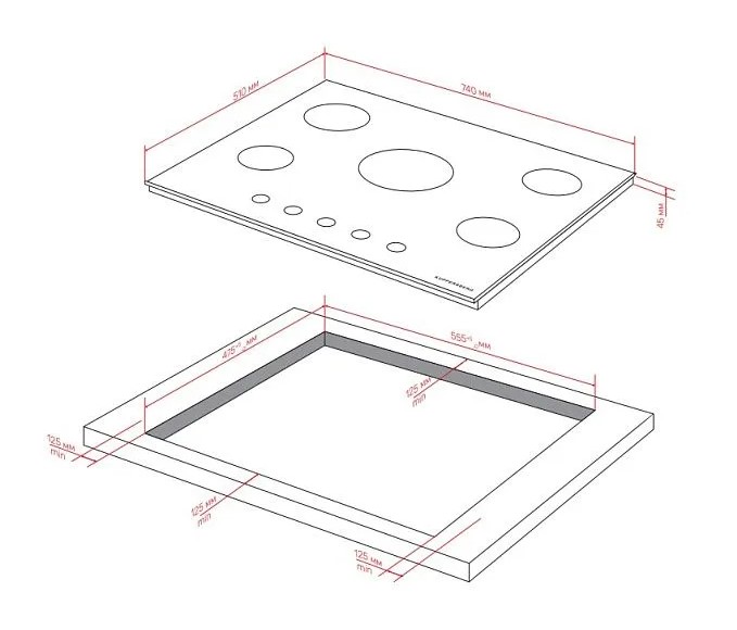Kuppersberg FS 76 B - схема с размерами к варочной панели на разных языках на Hausdorf