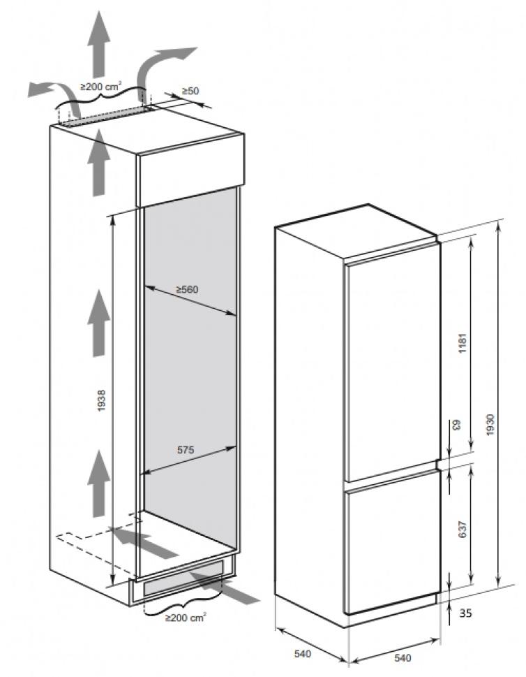 Kaiser EKK 60193 - схема встраивания с размерами к холодильнику на разных языках на Hausdorf